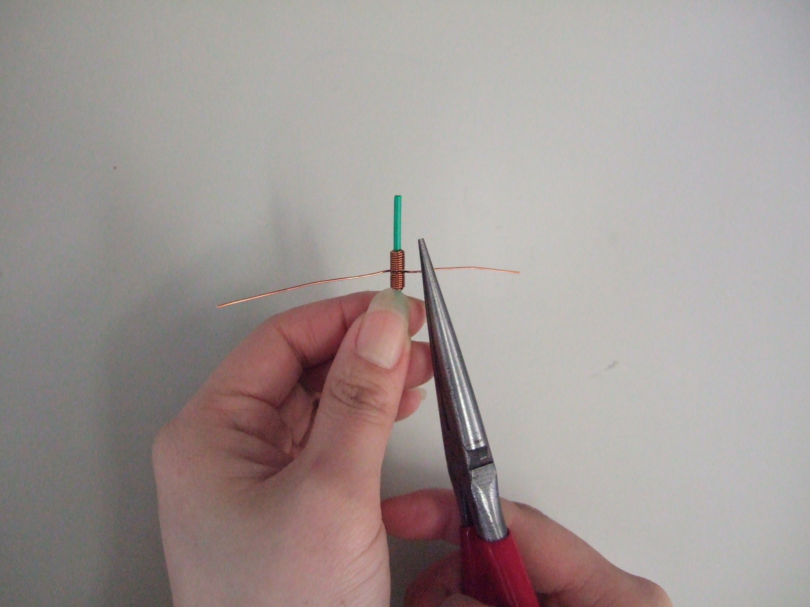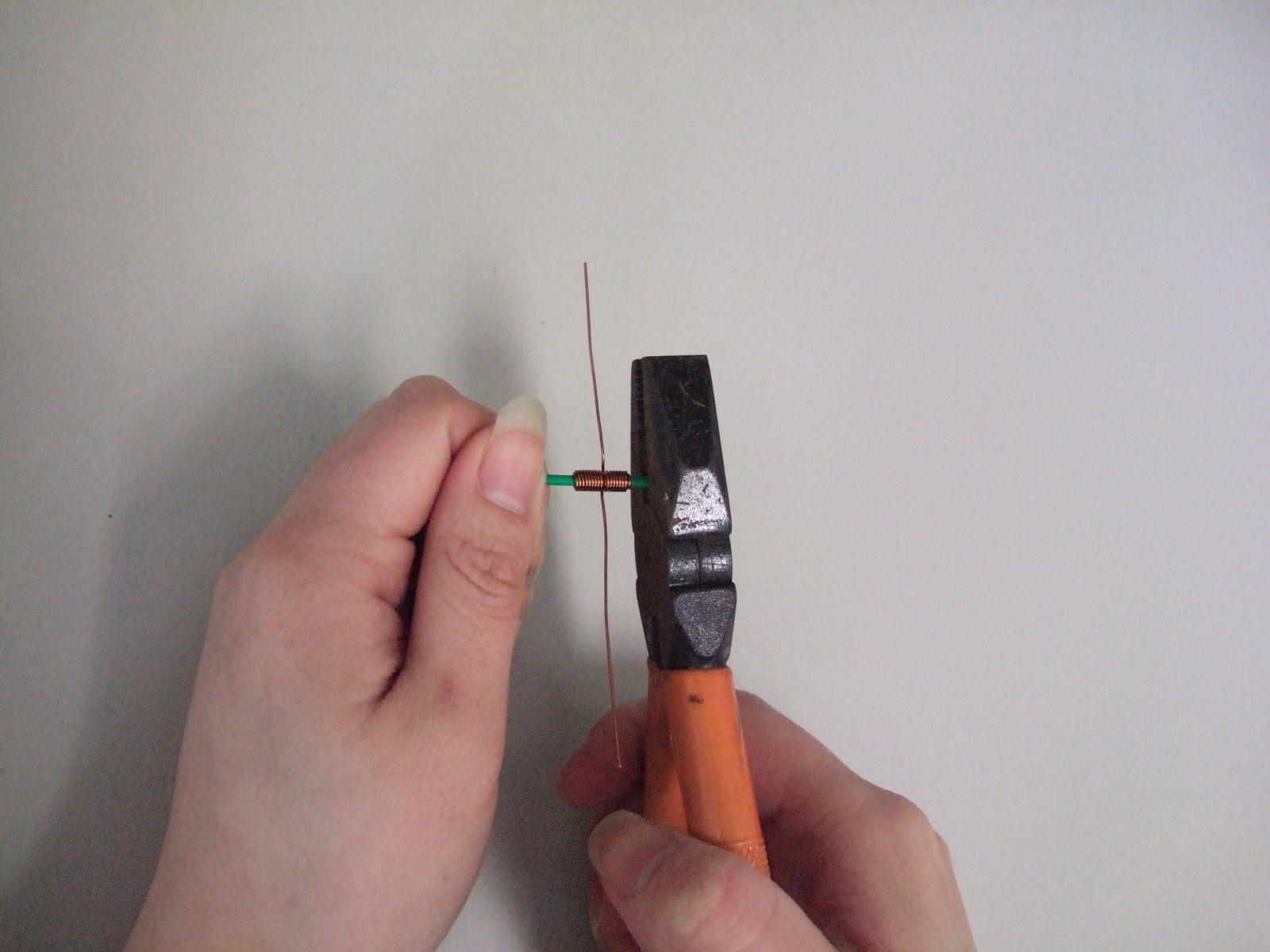 まず,針金の中心にペンチの刃で少しキズを付けます。(エナメル線が滑りにくくなる)